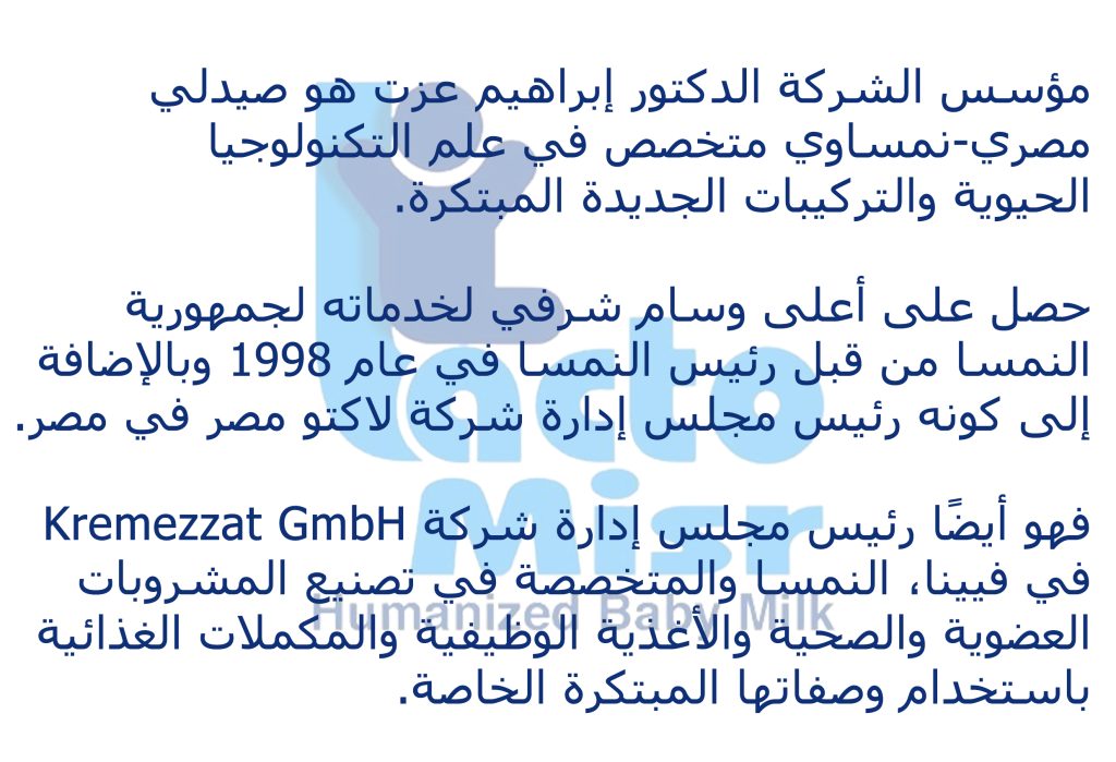 «تم الحصول على الخبرة التقنية لإنتاج حليب الأطفال من إحدى أكبر الشركات الألمانية، Milchwerke Mittelble GmbH – ألمانيا، والتي تُعتبر من بين القادة القلائل عالميًا في إنتاج حليب الأطفال. وقد تحقق ذلك بالتعاون والمساعدة من شركة Vogelbusch – النمسا